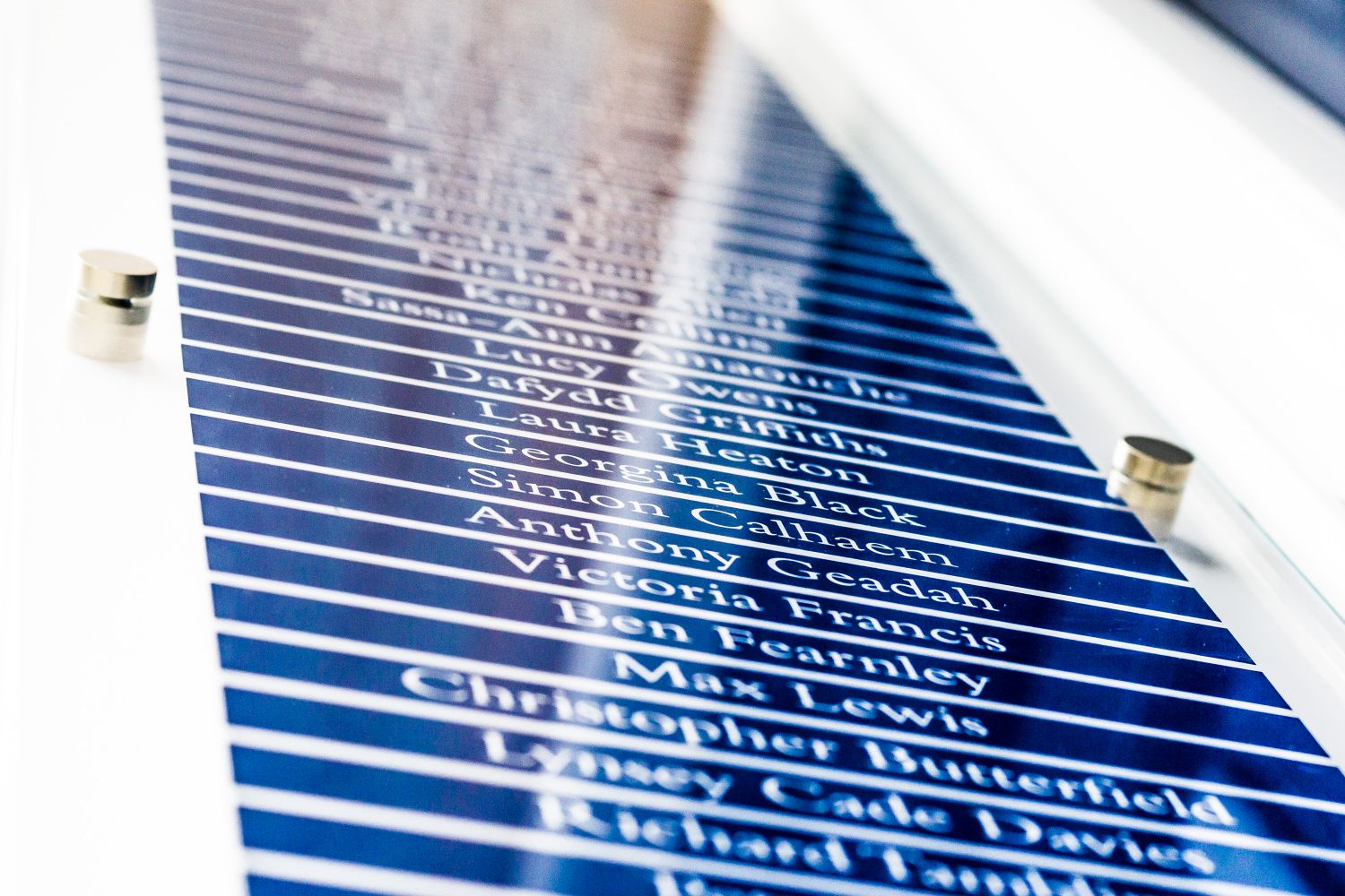 We’ll usually build a rectangular plaque made from low iron toughened glass that’s ultra clear for legibility, with the information applied to the reverse or the front of the panel in opaque or frosted vinyl lettering, depending on the desired effect.