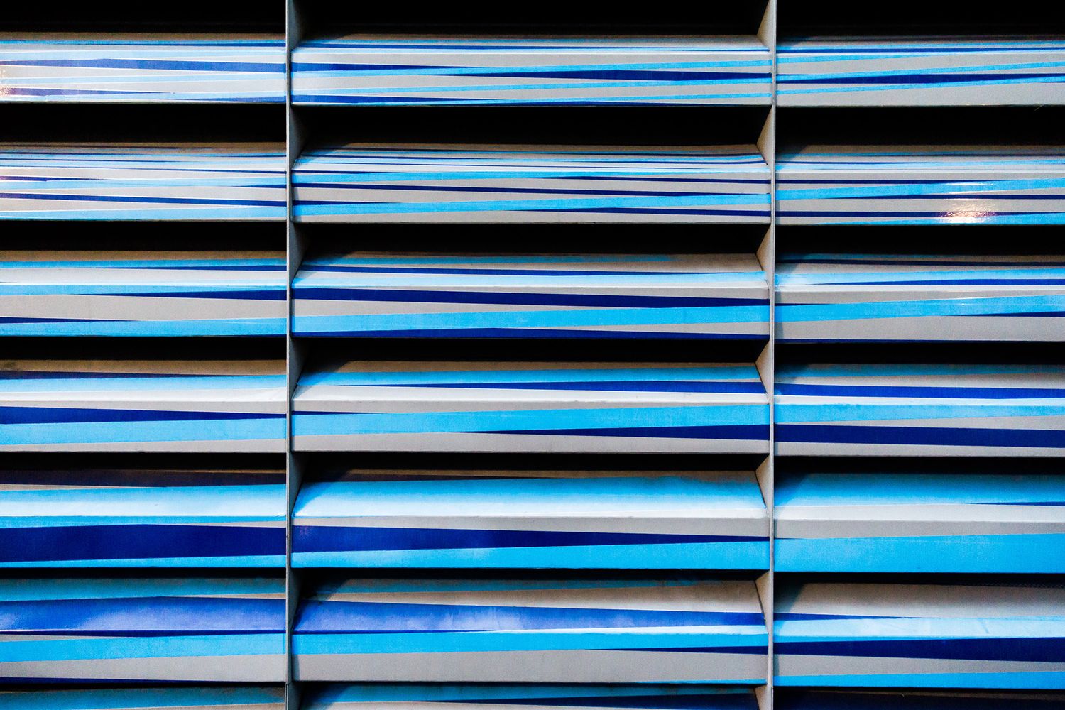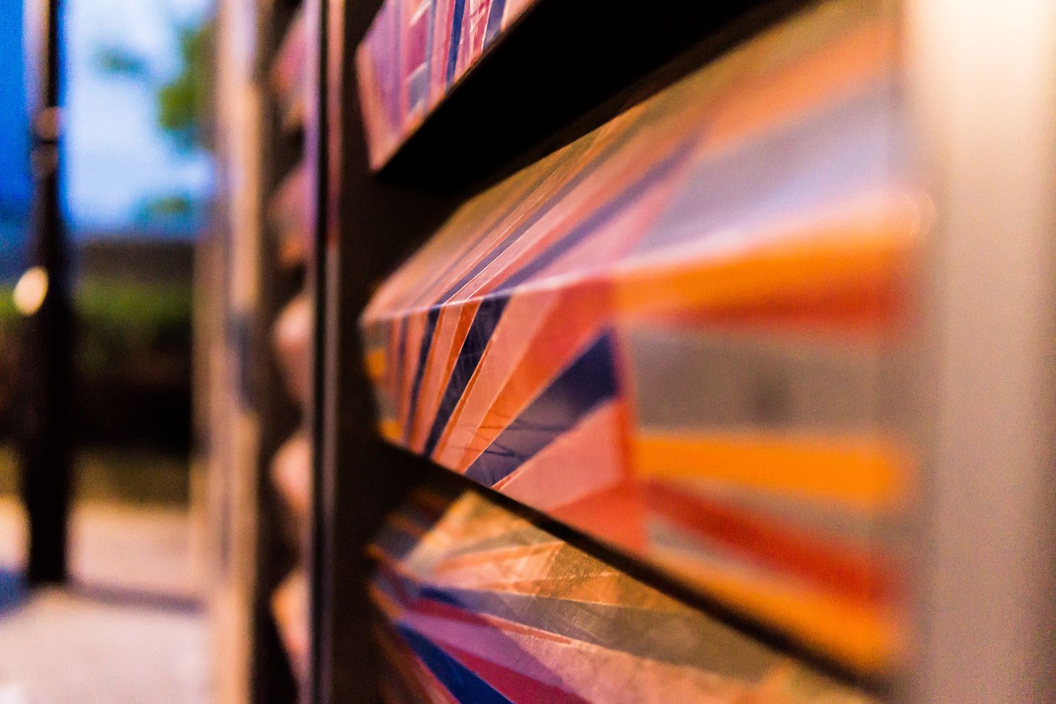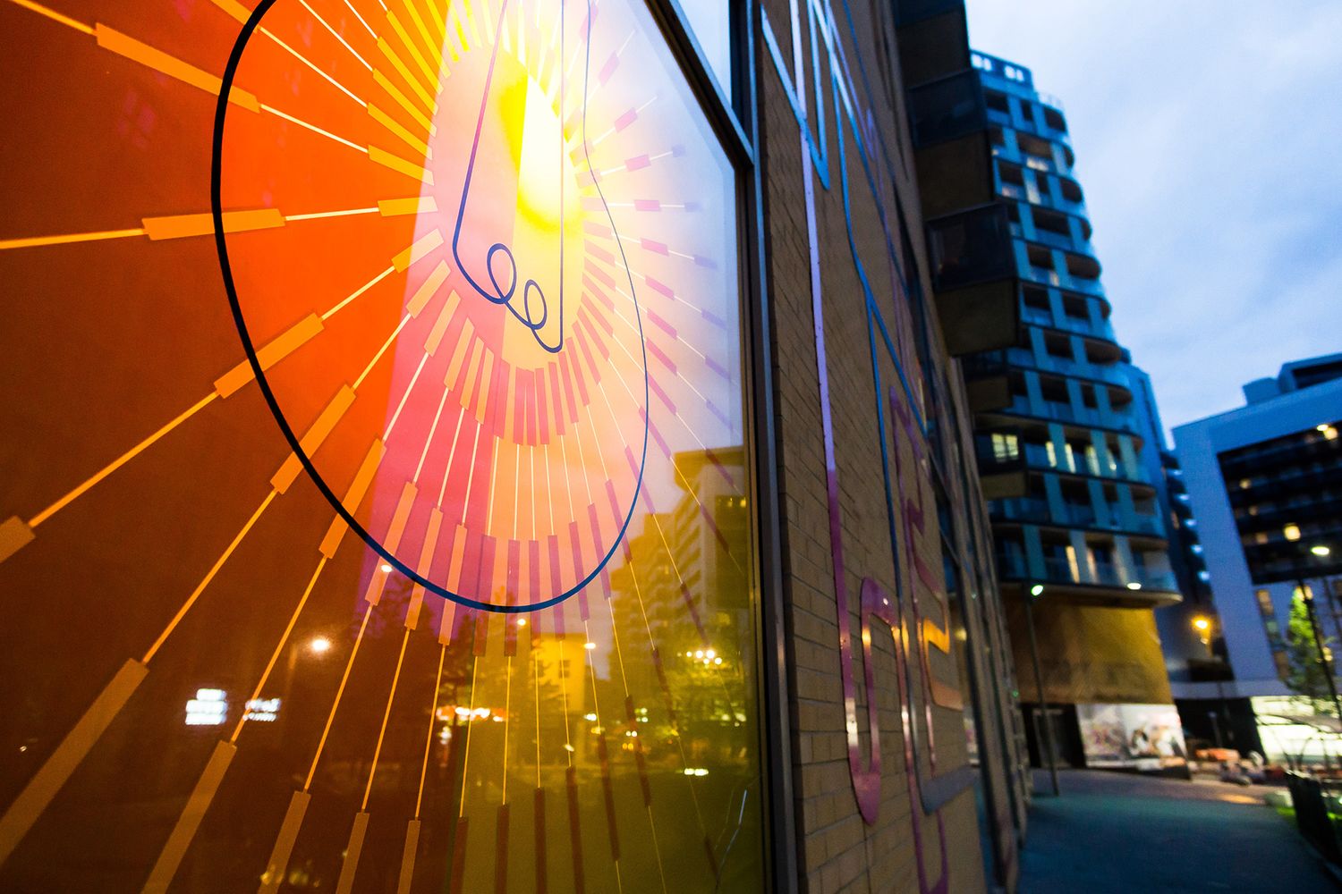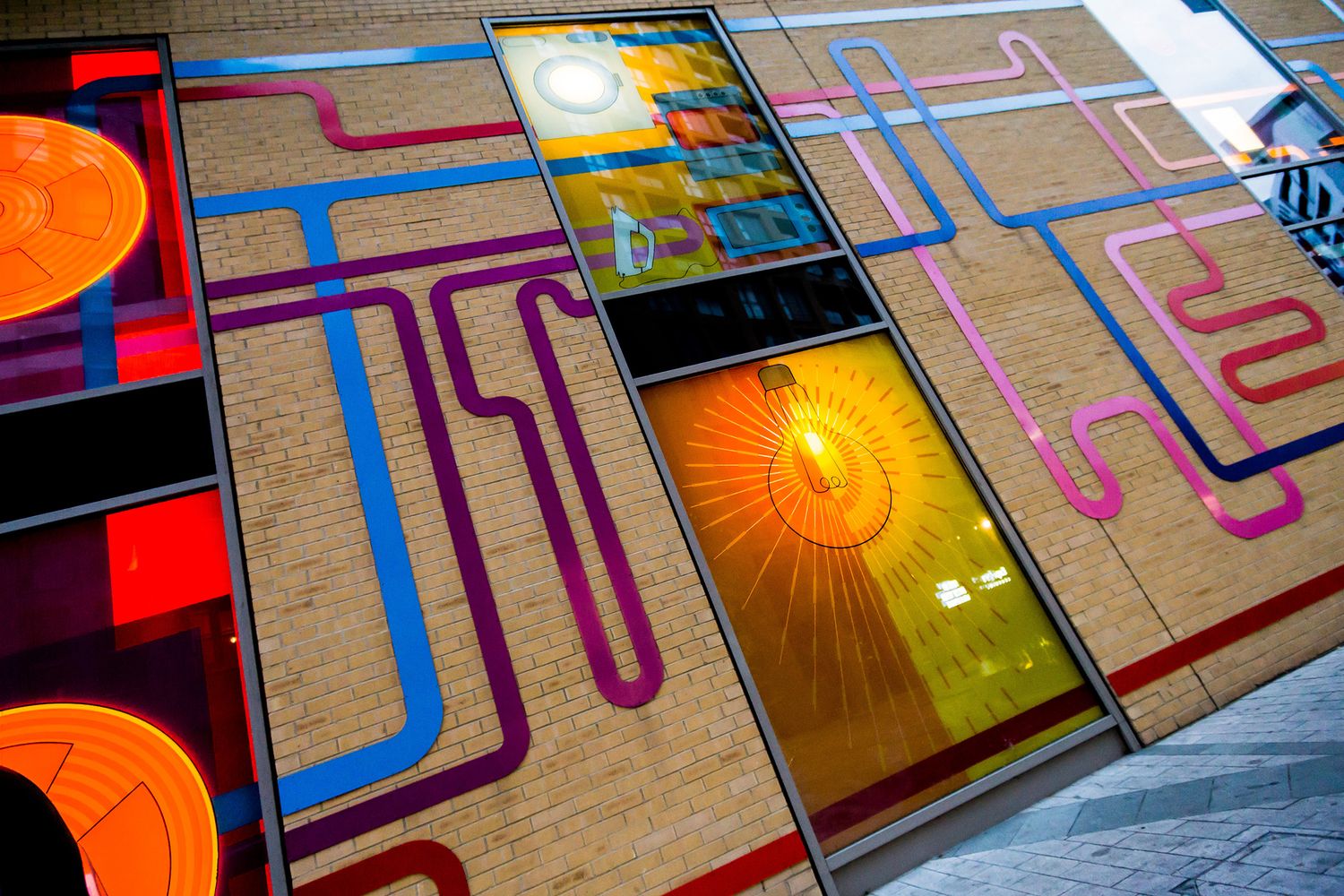 We worked from the inside-out, carefully hand applying graphics to each window over the course of several weeks. Armed with a colourful array of 3 metre long vinyl, we used translucent and opaque films to translate Martin’s theme into back-lit windows. Based in a busy, gritty, dusty and cold construction site, we set off to apply hardy vinyl to the exterior and overcame some pretty tough work conditions with tradesmen everywhere. Many cups of builders tea were consumed. Finally there was paintwork and a sprawling system of coloured pipework that needed to be screwed flat into the building fabric to ensure it couldn’t be used to climb up, and voila! We were done.