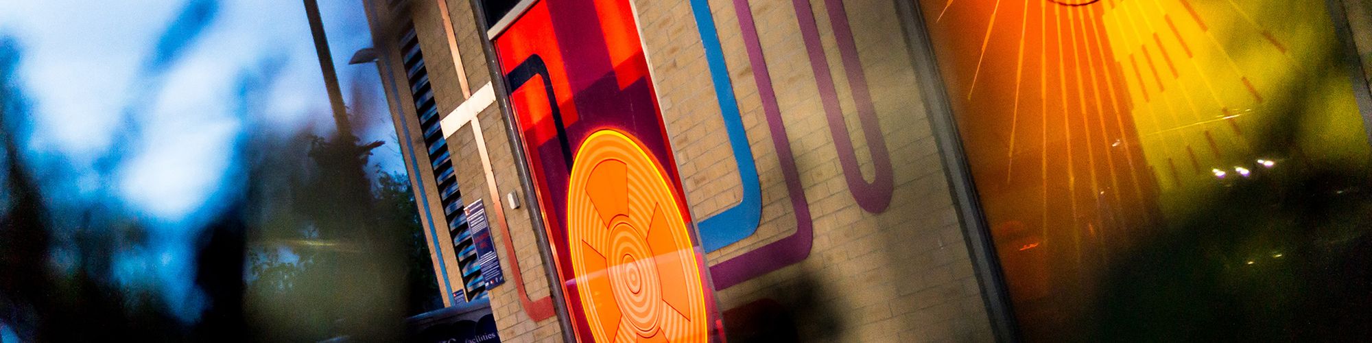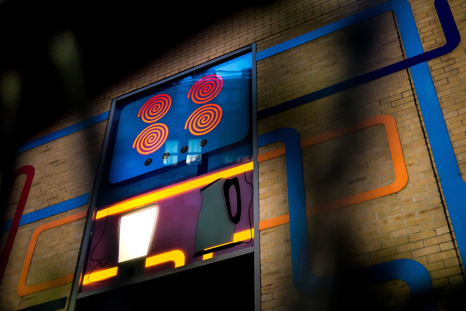 This was not our first time collaborating with Martin and he asked for our help in putting forward a proposal for an exterior design showing how the power produced for the building would be used. His artwork depicted giant glowing lightbulbs, spinning discs and pipelines of electricity. It would cover the outer surface area of the whole ground floor, including eight windows split across four panels, as well as the metal louvered shutters of the outdoor storage units. It still amazes us how our journey on this project started by producing small sample panels of glass for his presentation, and ended with making his vision a 35 metre reality!