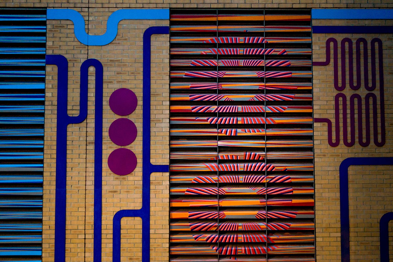 What’s all the fuss we hear you say? Well, as well as heating everyone’s homes and the on site leisure centre, the energy centre would supply excess electricity to the National Grid, and use the revenue to offset the cost of producing heat. Once fully operational, it was expected that carbon emissions (caused by traditional gas heating) would reduce by over 30%. Celebrating all of this with large scale architectural artwork was part of a cultural strategy for Barratt Homes, as the developer sought to create a stronger identity for Lewisham, improve its public spaces and encourage pedestrian use.