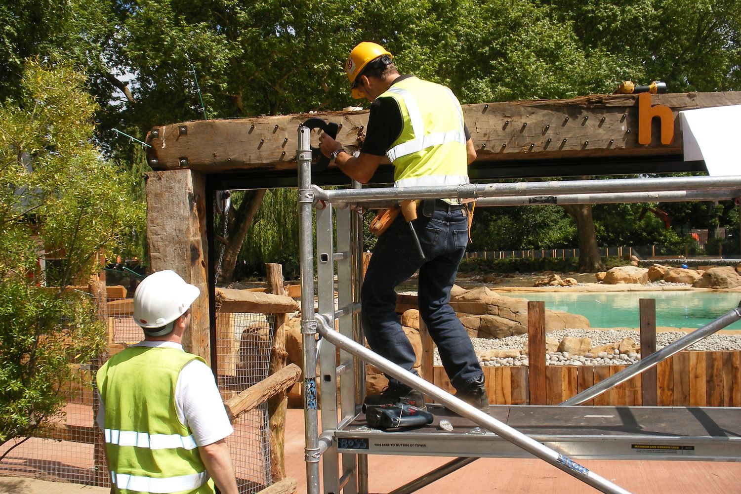 Embracing ZSL’s practice of using natural materials where possible, the rectangular arch was made from three reclaimed oak beams, with the largest some 250mm thick and 4000mm long. It would be crowned with the words ‘Penguin Beach’ and a visual of the playful penguins to attract the attention of a young zoo-going audience.