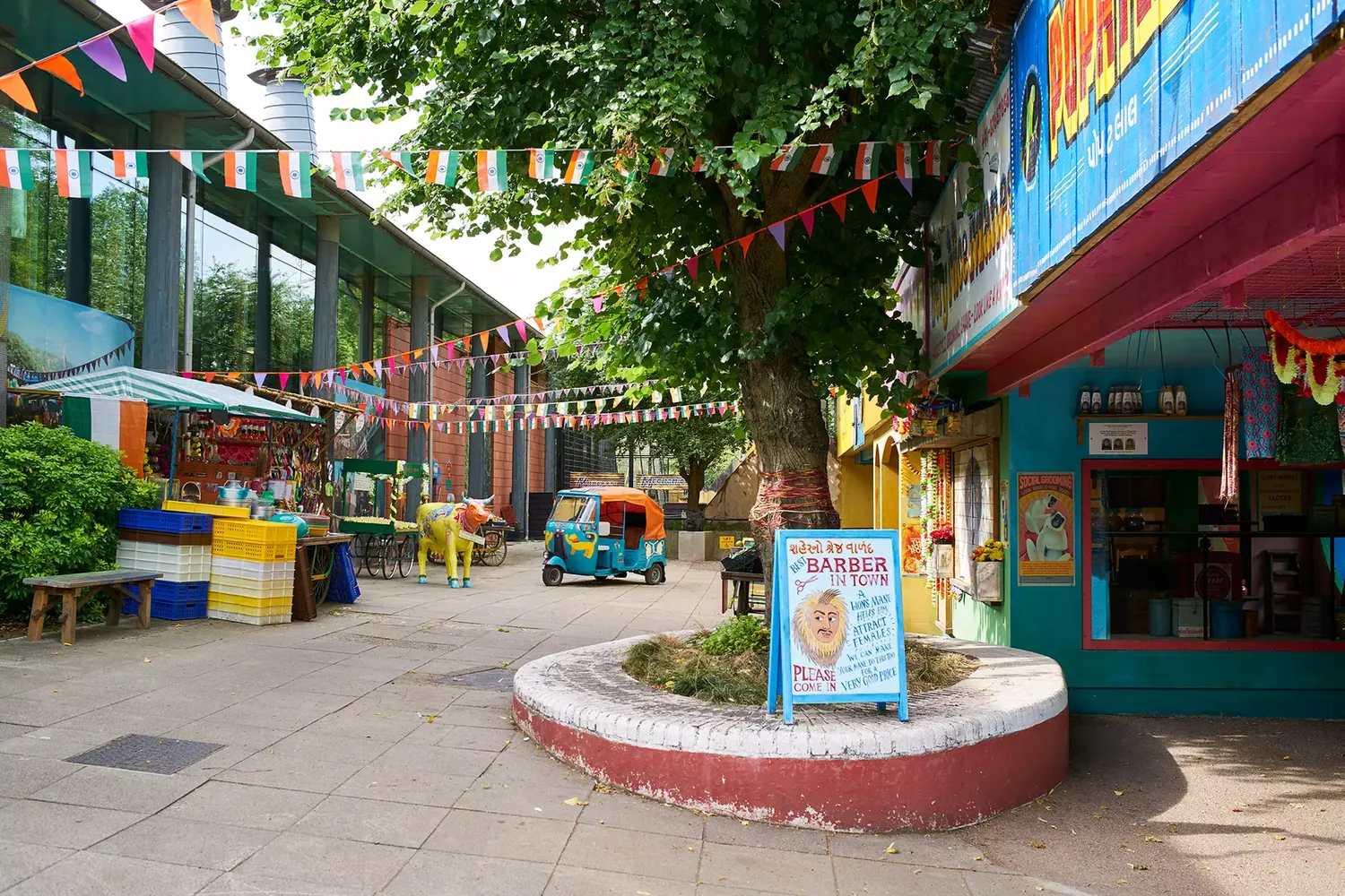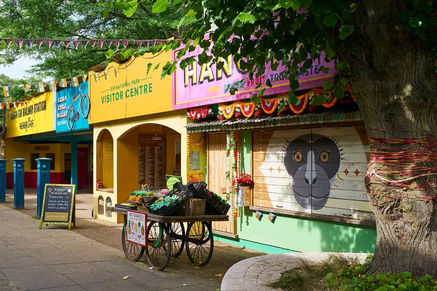 Inspired by the Asiatic lions’ forest home in India’s Gir region, the exhibit was designed to feel transportive from the moment visitors arrive. The painted shopfronts, market details and richly layered signage all contribute to an atmosphere that feels closely observed and full of personality, with small visual cues helping build a convincing sense of place throughout.