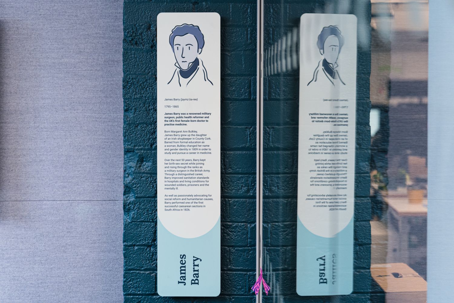 The meeting room identifiers were central to the rebrand. Our original proposal was a square shaped metal panel for each suite, overlaid with a unique vinyl print of a notable person who has contributed to the science or practice of medicine. They would be represented either by a photograph of their face or a pictorial line drawing, along with their name. As the process went on, the client took the lead and evolved the idea themselves, merging both the photo realistic and minimalist options, to land upon a graphic illustration. They expanded the copy to include a larger biographical description of each historical figure, and so naturally the signs shapeshifted into long vertical plates.