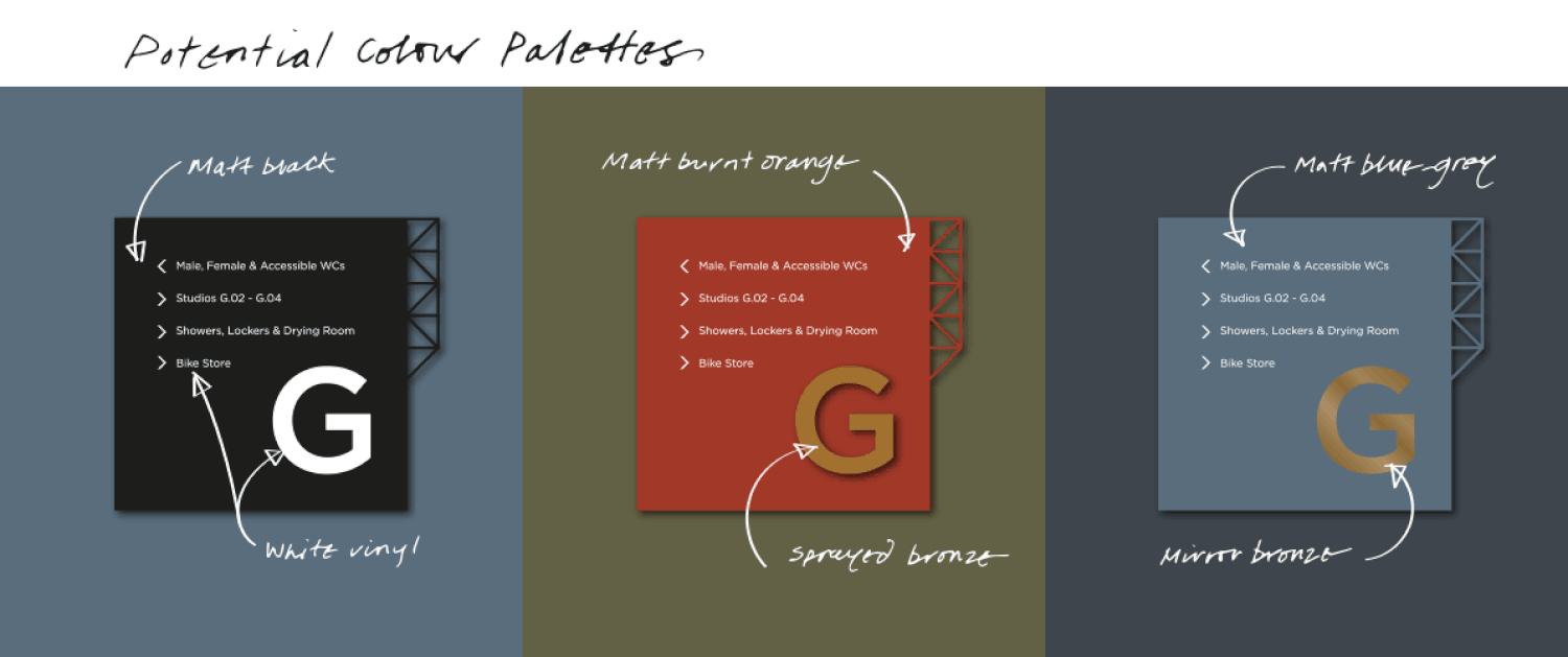 Putting pen to paper, we developed a signage system in principle that is intuitive, easy to understand and uniform throughout the space, sense checking it with the client and evolving it through improved iterations where necessary.
