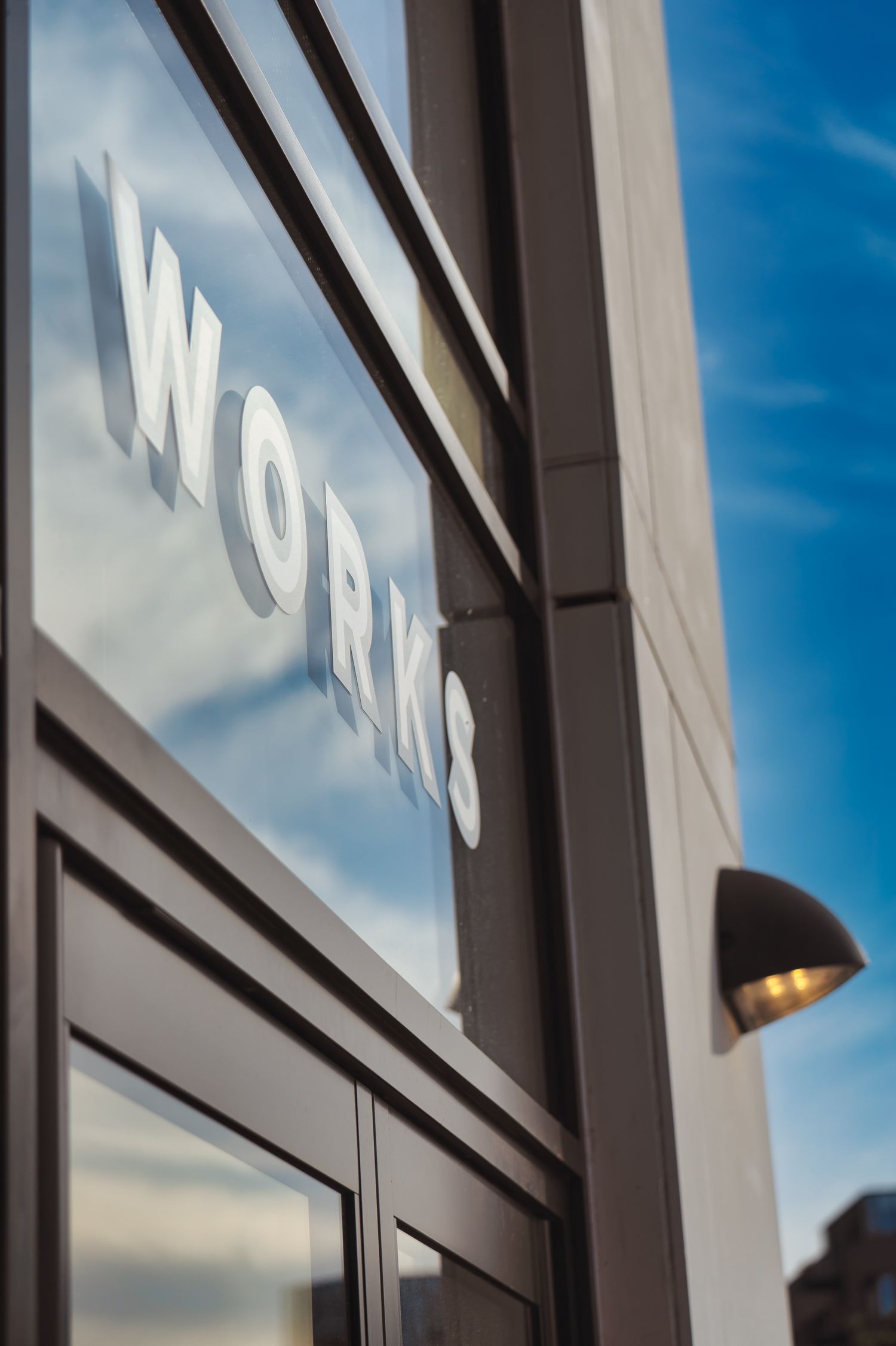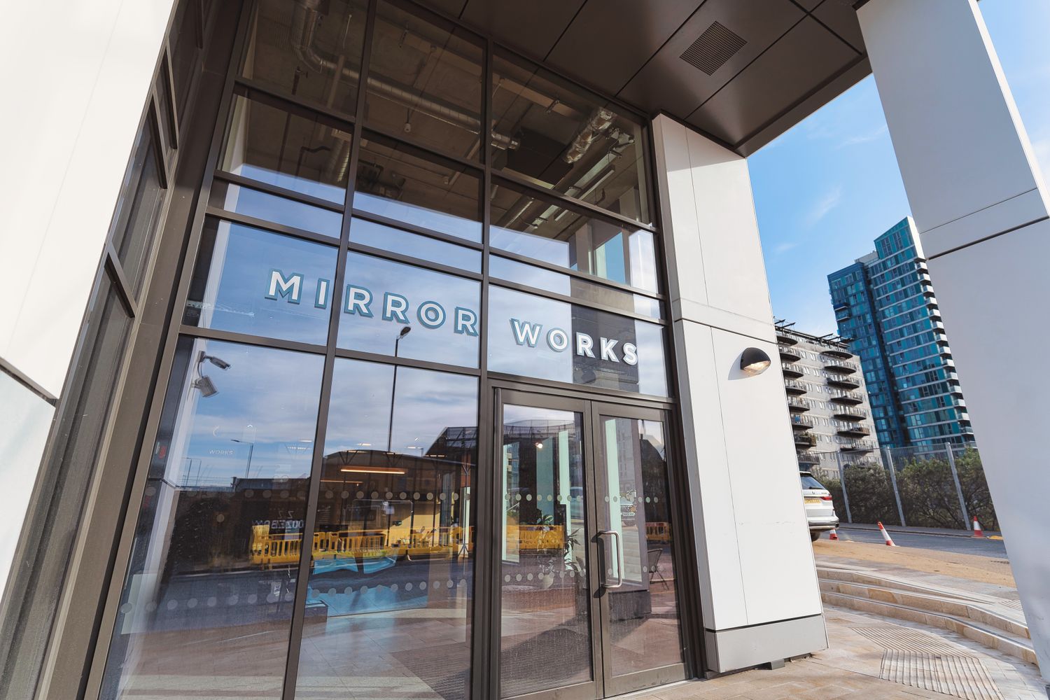 The exterior signage, prominently displaying the Mirror Works logo, is crafted to be both eye-catching and elegant. The choice of materials and the precision in design reflect the building's modern architecture, providing a welcoming first impression.