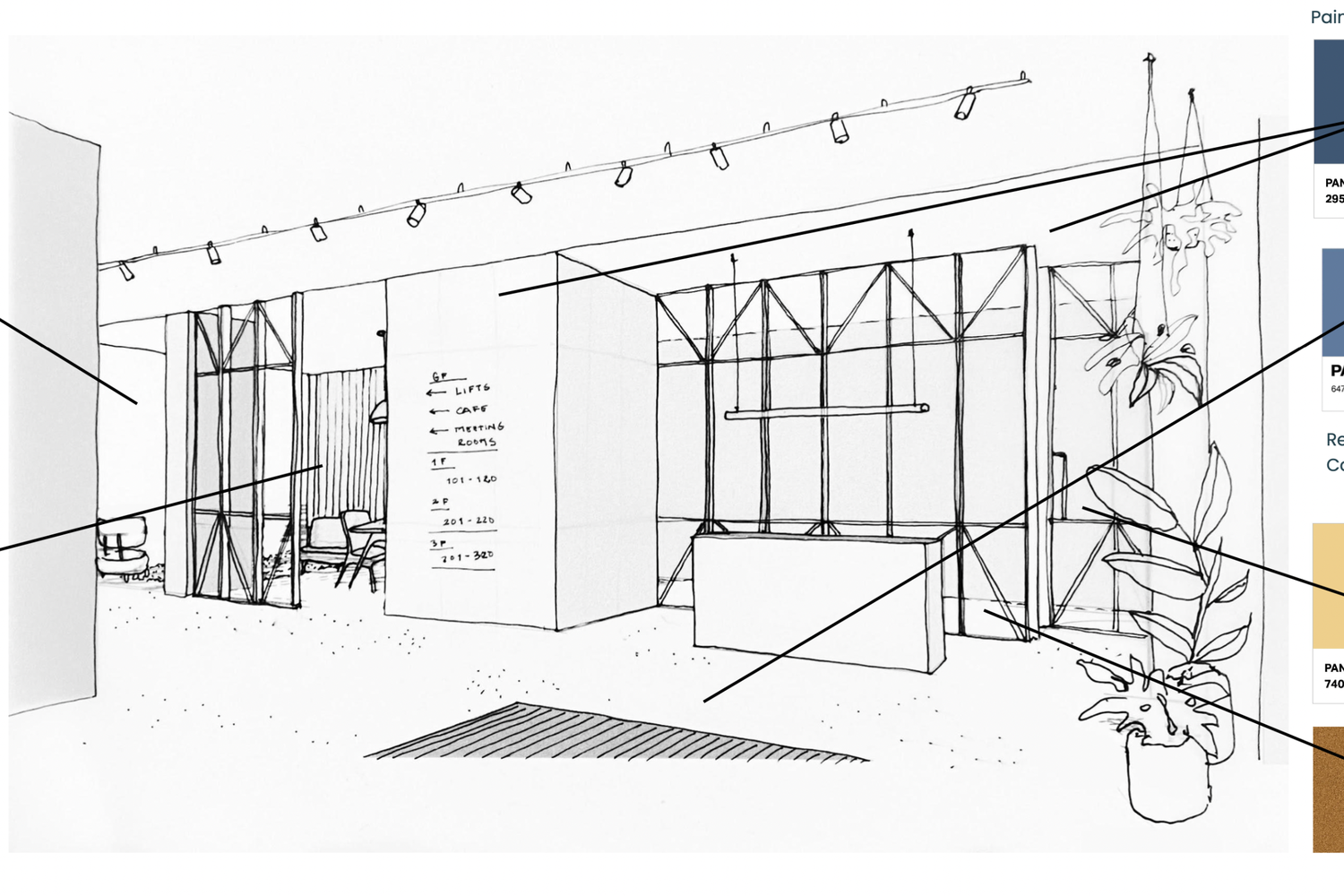 Our collaborative journey began with Trifle's artwork for the interior design, as seen below. We immediately noticed the zigzagging black metal lattice frames on the glass partitions. Depending how you looked at them, they resembled an M or W - the two letters that make up the logo for Mirror Works. A subtle nod that we knew we wanted to weave into our work.