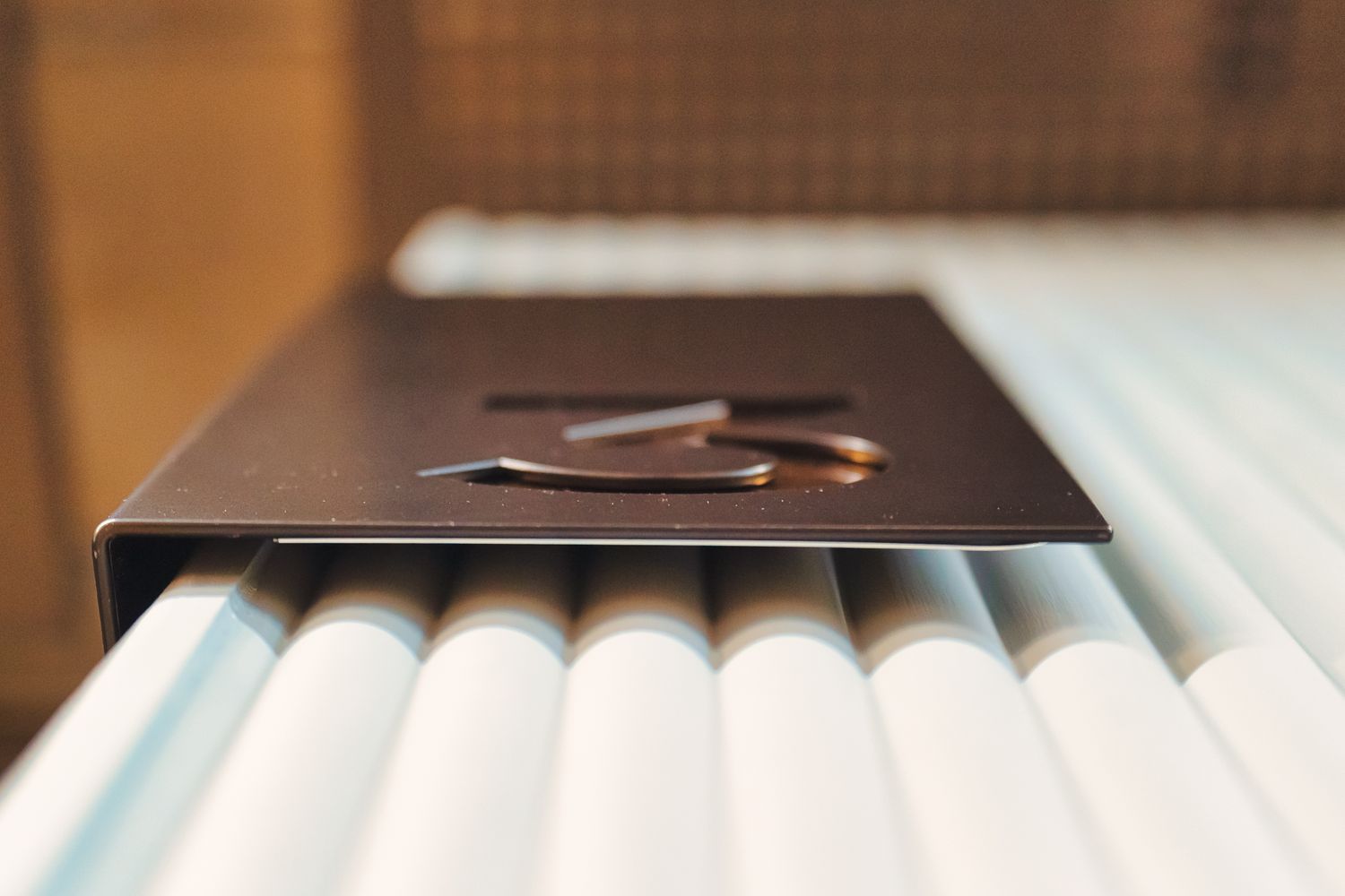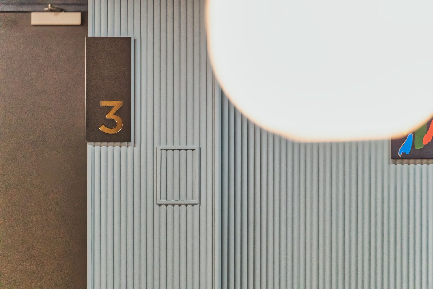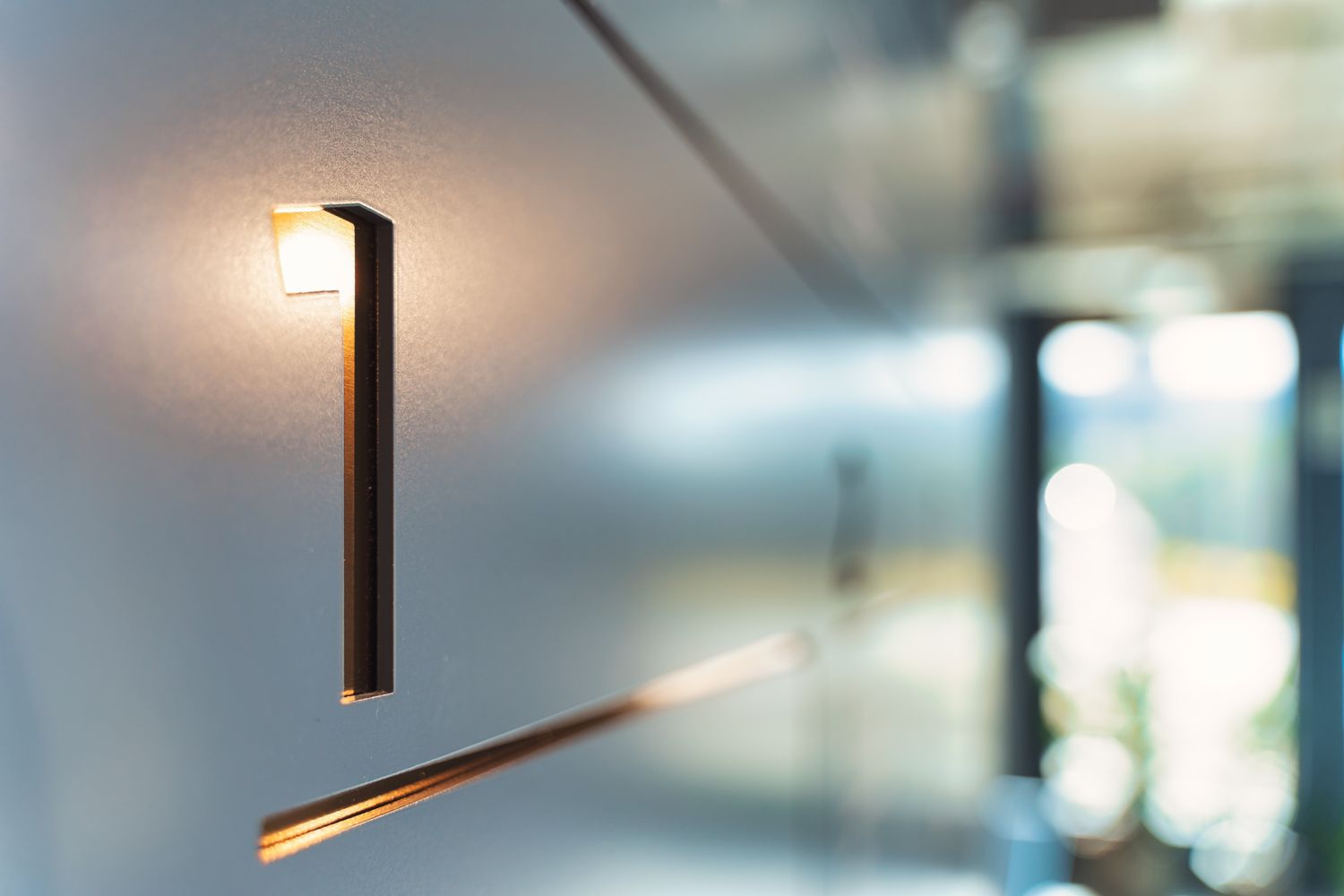 The floor number signage takes the form of sleek metal plaques that are seamlessly mounted and made to wrap around the tubular panelling that pads the landing walls on the upper floors. The plaques feature a fret cut number backed by glistening brass, adding a textured quality to match the felt grooves beneath while enhancing visibility. As one of the most prominent and utilised sign types from our collection for this project, the plaques appear on various corners on every floor, creating a visual language of luxury throughout. They function as an effortlessly chic user guide and are a sophisticated design choice that sits cohesively within the modern aesthetic of the interior.