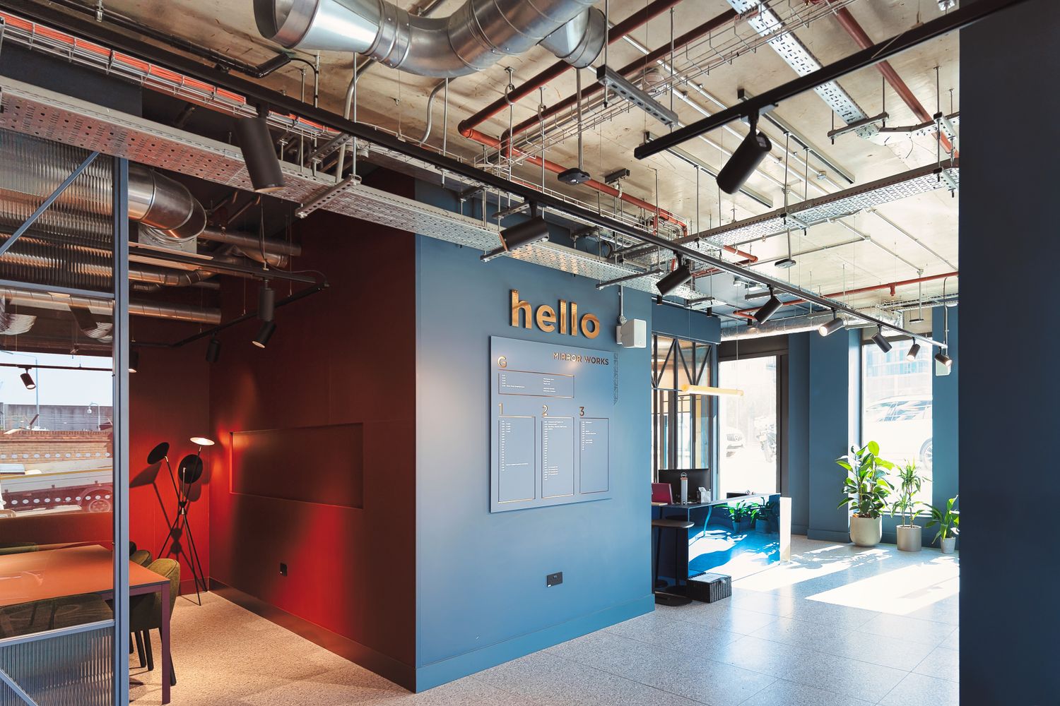 The name Mirror Works is a nod to the origins of this building as a glassworks factory; inspiring the design aesthetic. This influenced material choices throughout, from a polished light fixture in the lounge and hi-gloss reception desk, to the sleek and shiny signage.