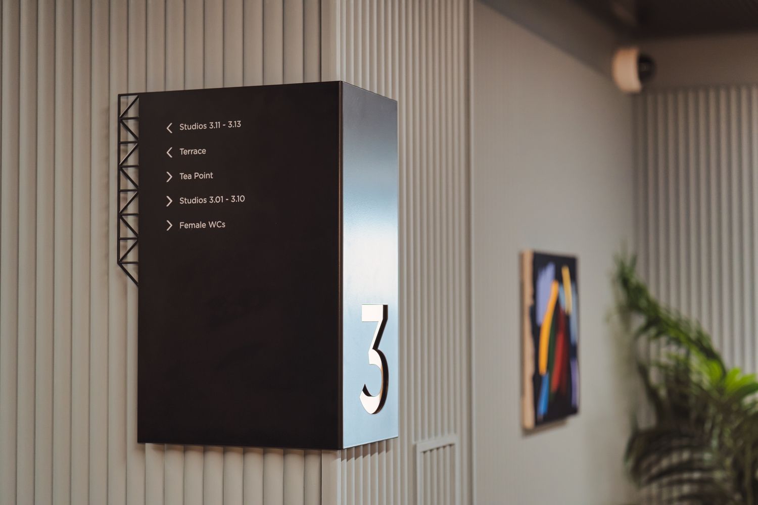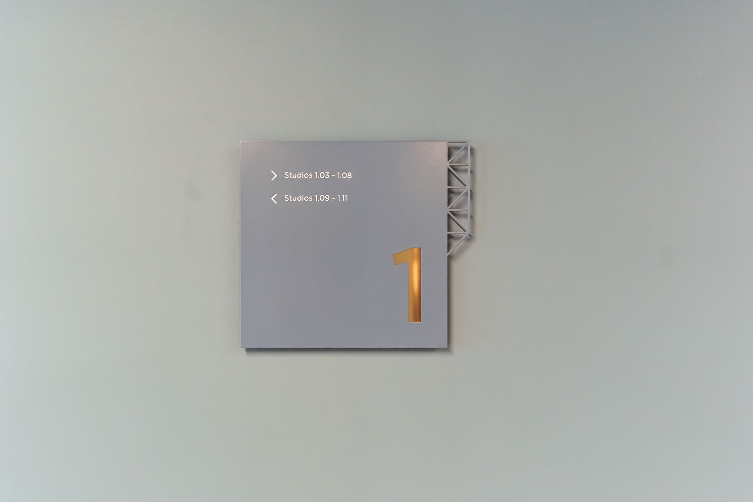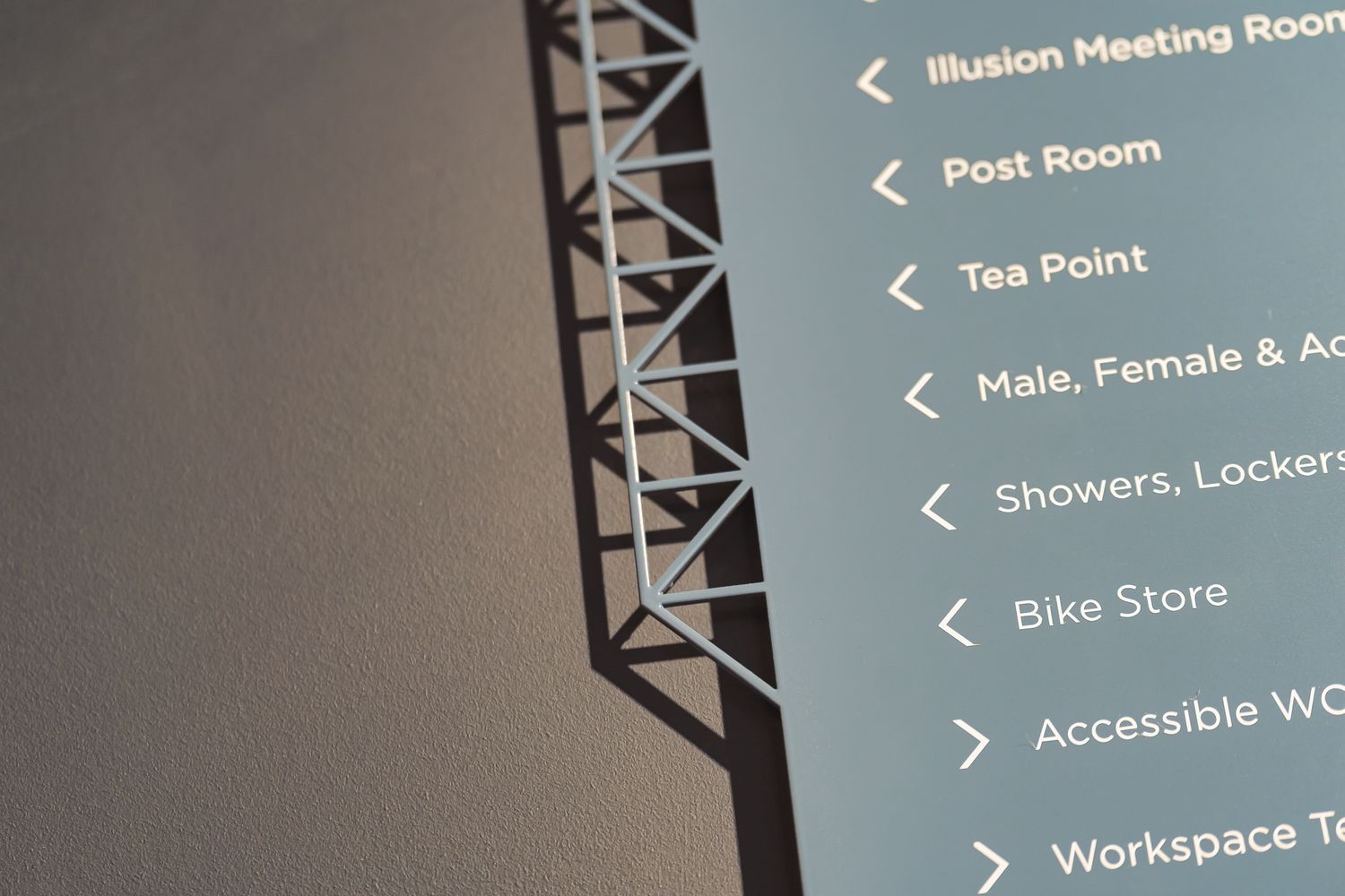 It includes the building name to alleviate any confusion, the essentials of what's where to allow straightforward navigation, clean typography, an intuitive floor-by-floor layout, minimalist fret cut lines to efficiently demarcate these, underlaid with slivers of brass to enhance engagement.