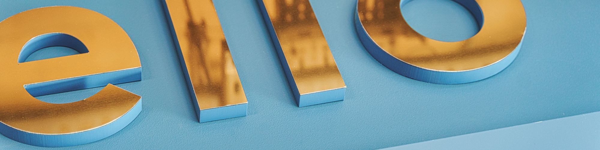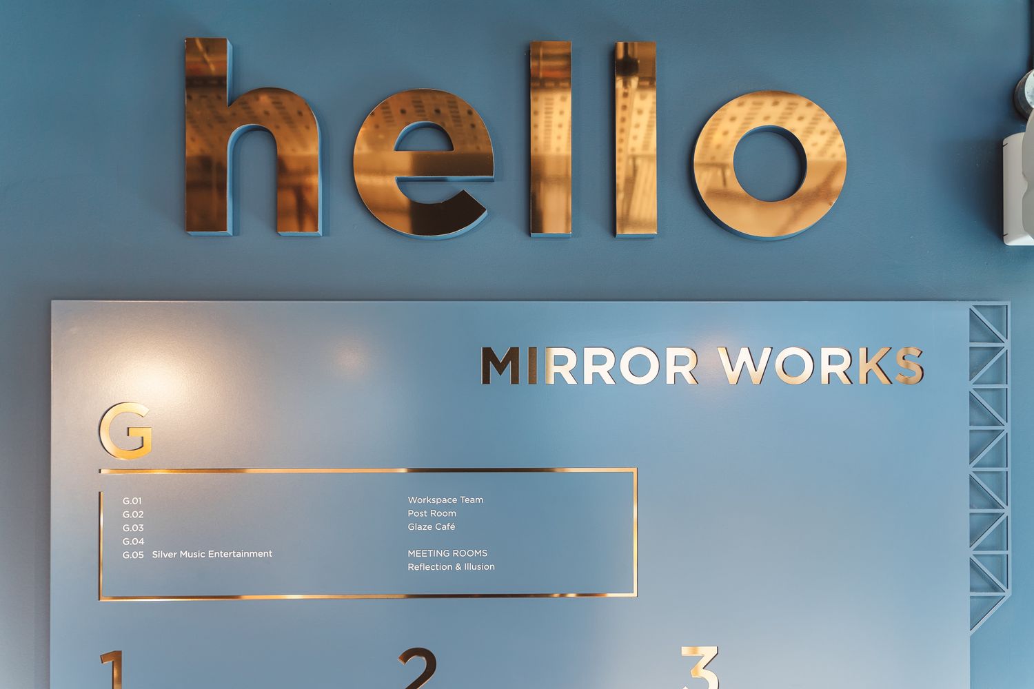 Above is a solid and resplendent 'hello' sign - built in brass 3D lettering, it serves a significant purpose by providing a welcoming touchpoint for visitors as they enter, setting a friendly and approachable tone for the entire space.