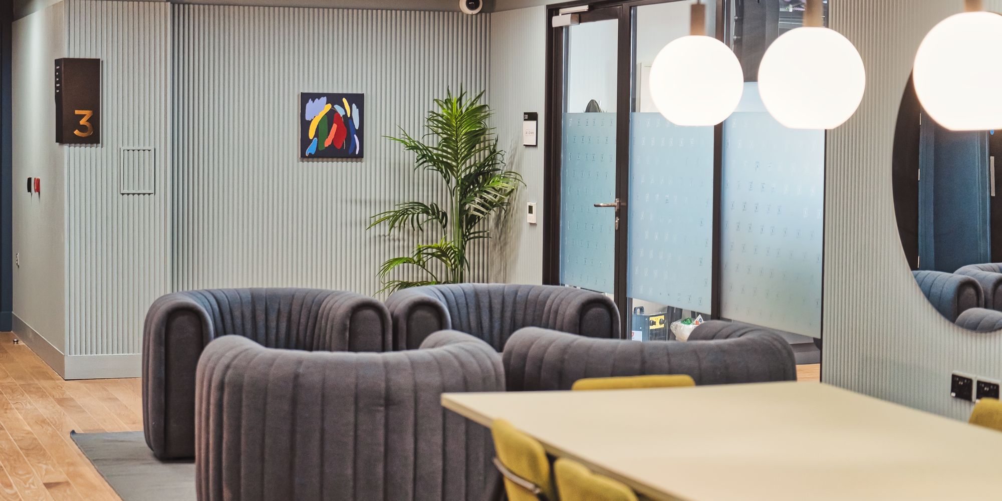 This sign is one of only two such prominent signs within the fabric of the workspace, with the other being a 'hello' sign situated above the directory at the entrance. Together, these two signs bookend the visitor experience within Mirror Works, offering both a warm welcome and a communal gathering spot, injecting the environment with sociable undertones.