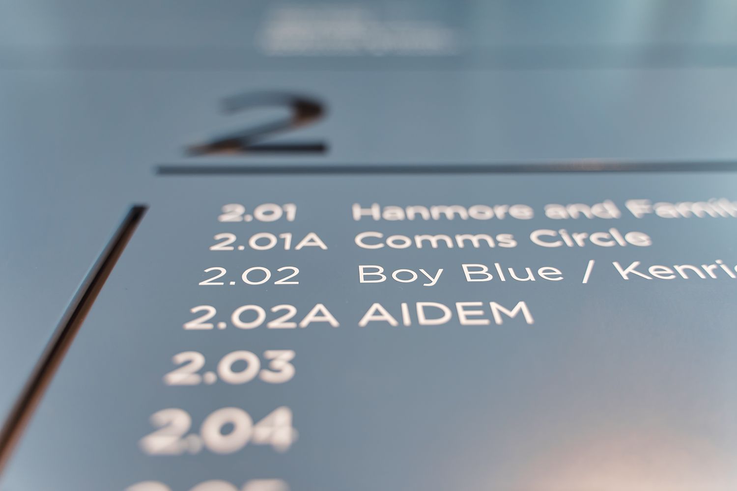 We positioned signs at crucial decision-making locations throughout the office, e.g. corridors, entrance areas and near lifts. Wall signs were set at eye level so they'd be spotted quickly and read easily, enhancing the navigation experience.
