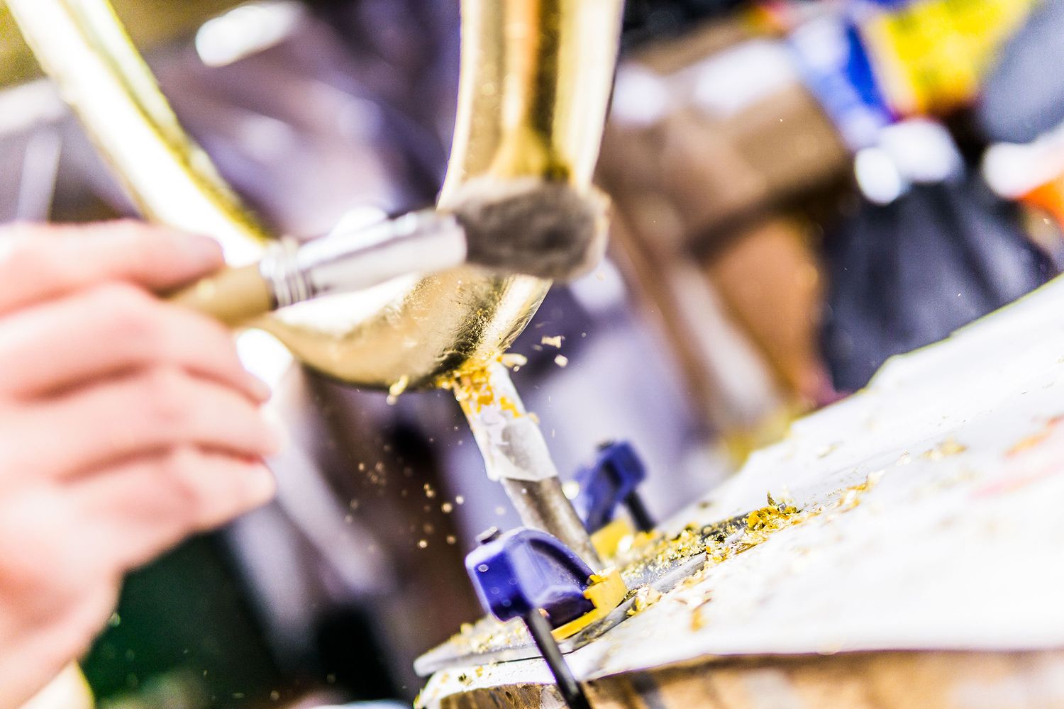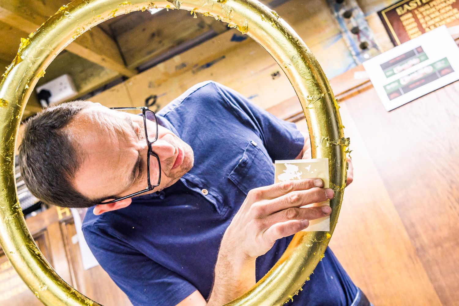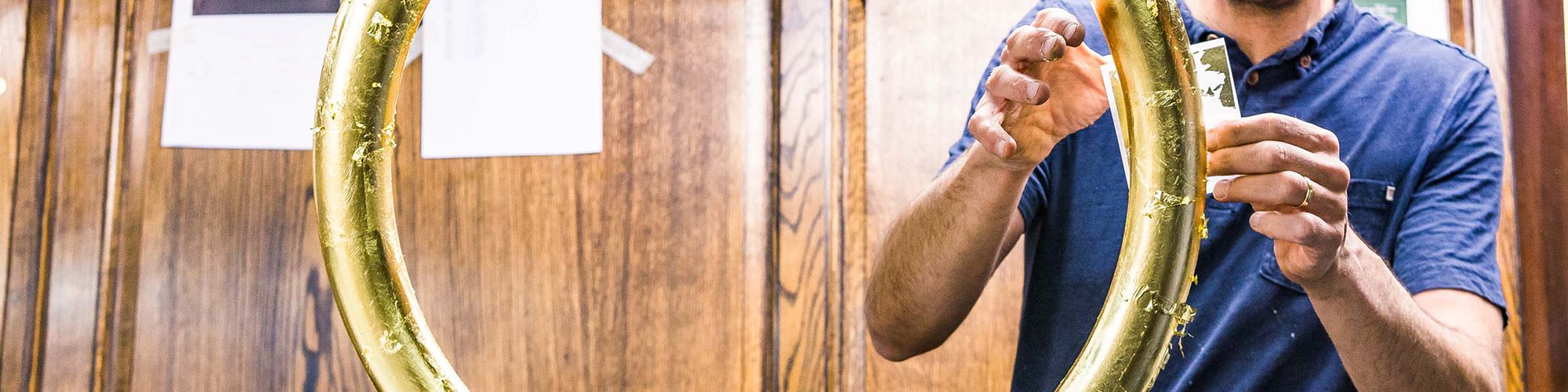 Bespoke hand shaped, gold gilded wooden ring, embedded with metal bracket and built with minimal fixings. 600mm x 25mm.