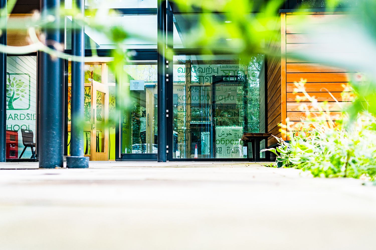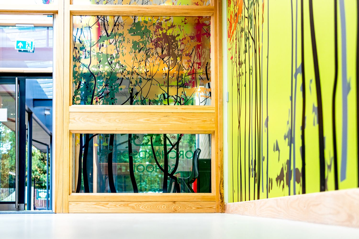 The installation culminated in a striking transformation of the school's main reception. The seamless integration of graphics and glass, coupled with the vivid colours of the woodland wallpaper, created a welcoming and energising entry point for students, truly embodying the spirit of Orchardside School.