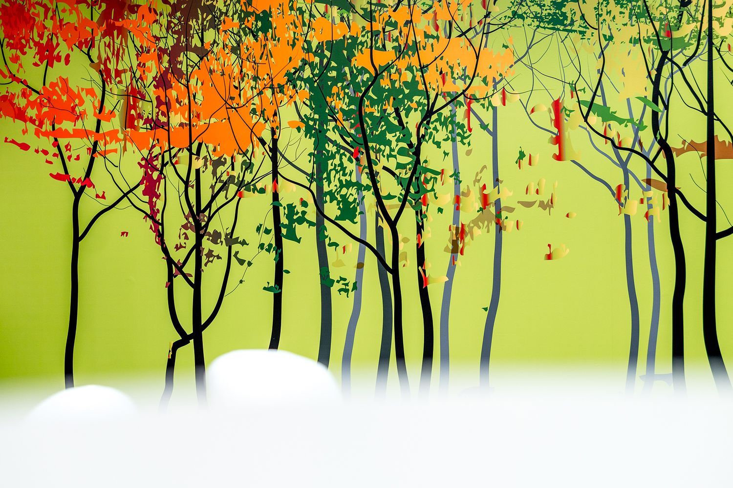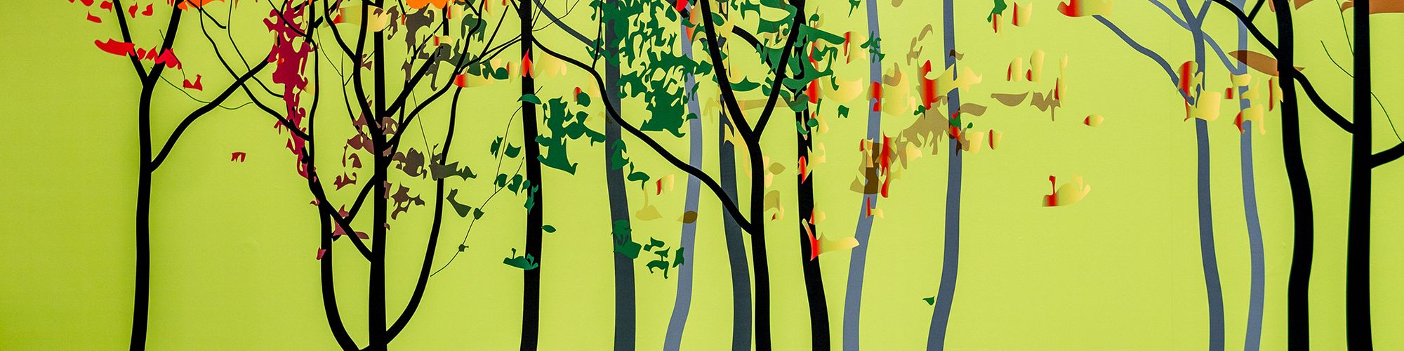 Next, for the main reception area, our design team aimed to capture the spirit of the brief. They imagined and built an inkjet laminate of a woodland scene in homage to the school’s name, featuring a flurry of auburn leaves against a striking lime green background to form a brilliant first impression for students upon their arrival, in both the metaphorical and literal sense.