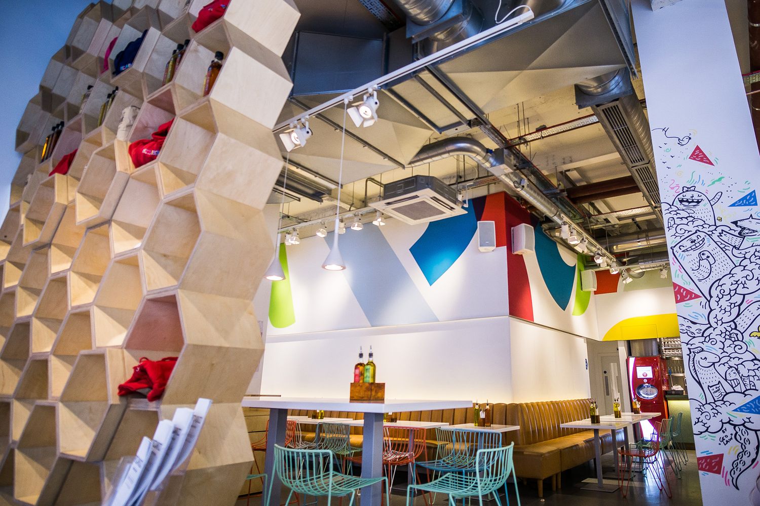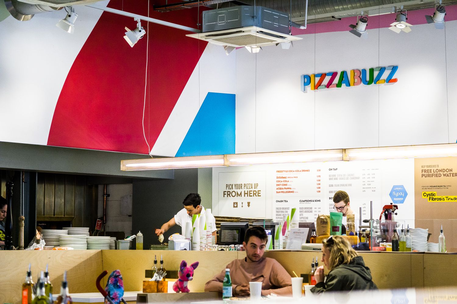 Pizzabuzz, a DIY pizza parlour following the concept of eat-in café chains with a seat yourself service and counters where you can ‘build your own’ from the base up, was originally set up in Worship Street. Tapping into Shoreditch’s trendy vibe, the owner took the industrial space and commissioned a design company to bring it up a notch.