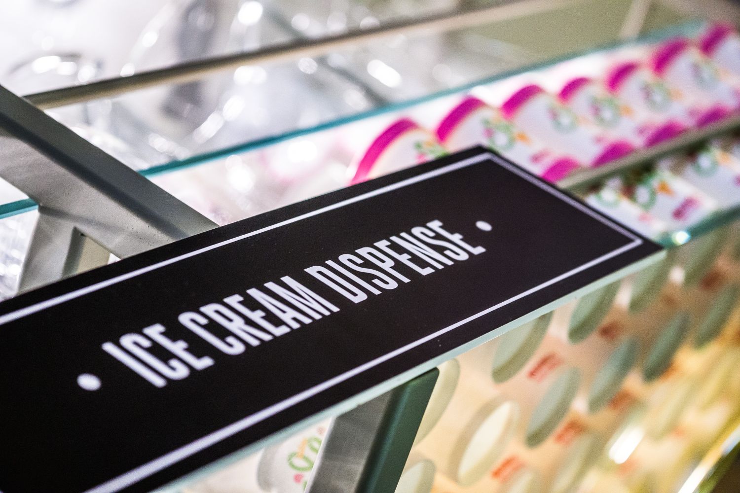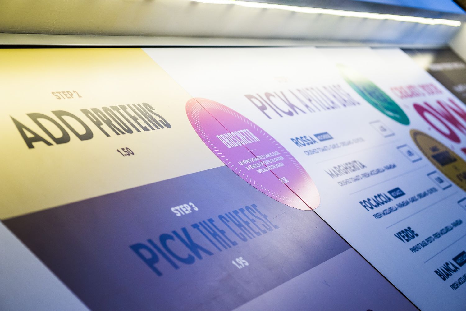 For our part, we set about applying the finishing touches and tying everything together. First off we brought in a team of hand painters to cast bright blocks of colour, shaped like parts of the Pizza Buzz logo itself, on the top halves of each wall. We also built up metal logos and strategically installed them to be as visible as possible, spraying each letter in a different Pantone® hue to match the ‘pastel meets primary’ colour theme on the walls. We then produced the menu boards underneath the counter, building them to be interchangeable so that they could slide into the given framework and keep the menu seasonal. The result was a zingy restaurant with bubblegum vibes that both feels fun and is functional. Total pizza cake right?