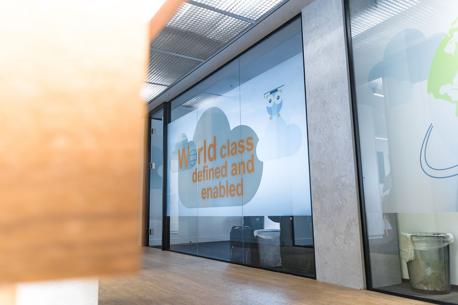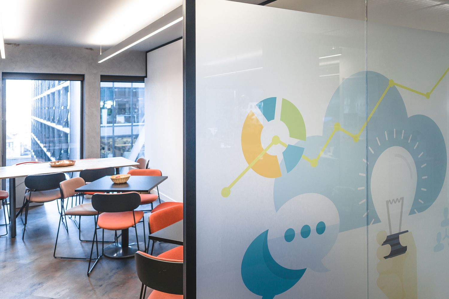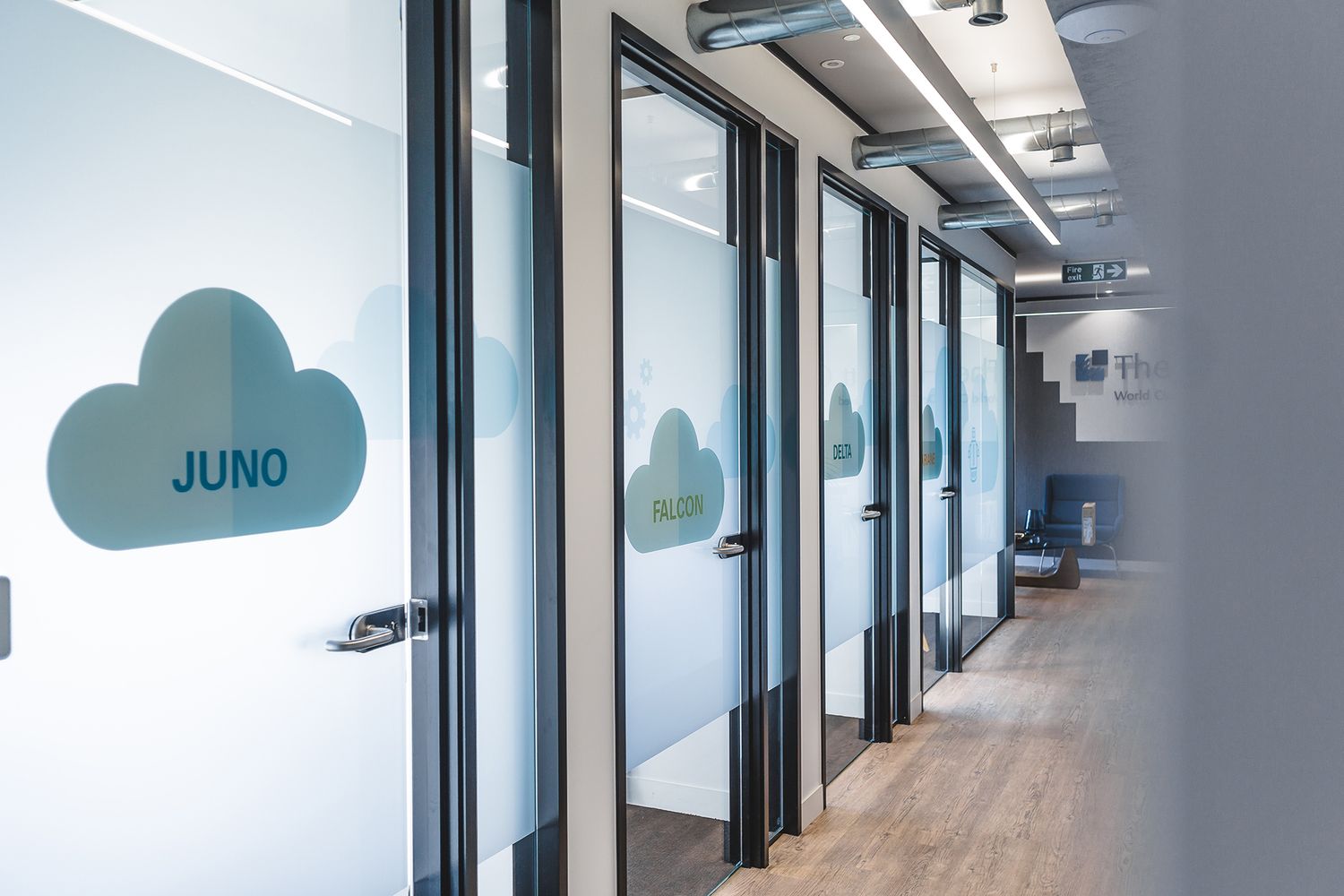 Our biggest challenge was to find a way to make the names of the meeting rooms visible only from the outside. After some careful consideration, we offered to back the text with block-out vinyl in the shape of clouds, as a way to hide the text from those sitting inside and as a solution that slots in perfectly with the design theme, and we are happy to report, the client was over the moon.