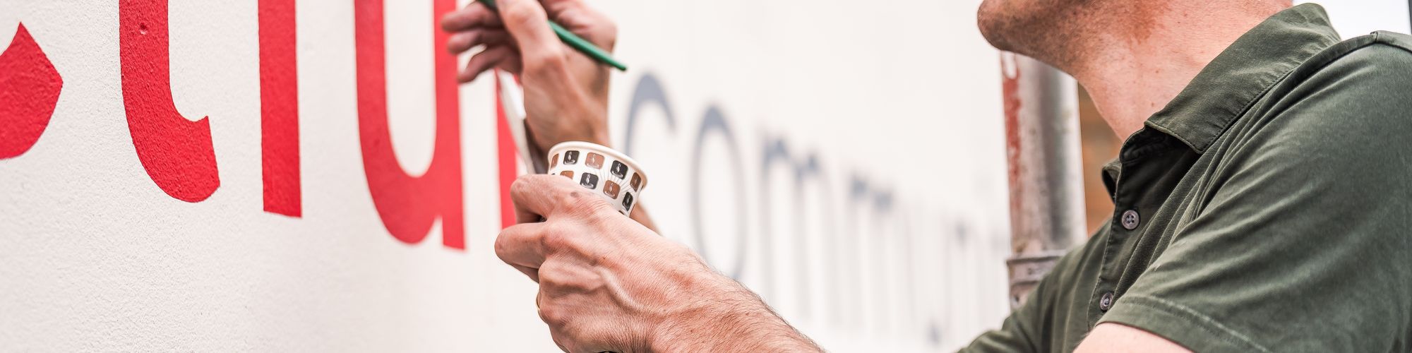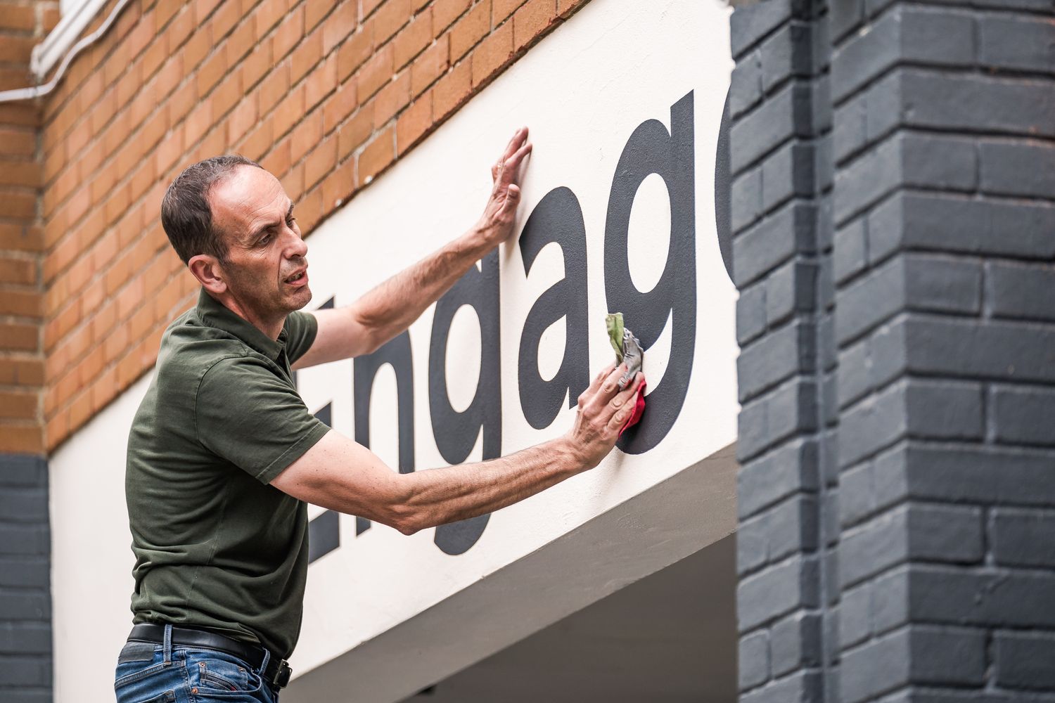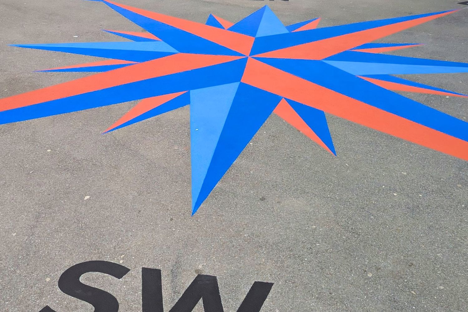 As work progressed, the scope grew to include a large hand-painted compass rose on the concrete forecourt – a symbolic nod to direction, learning and aspiration – alongside plans for matching internal signage that carried the same confident tone throughout the building.