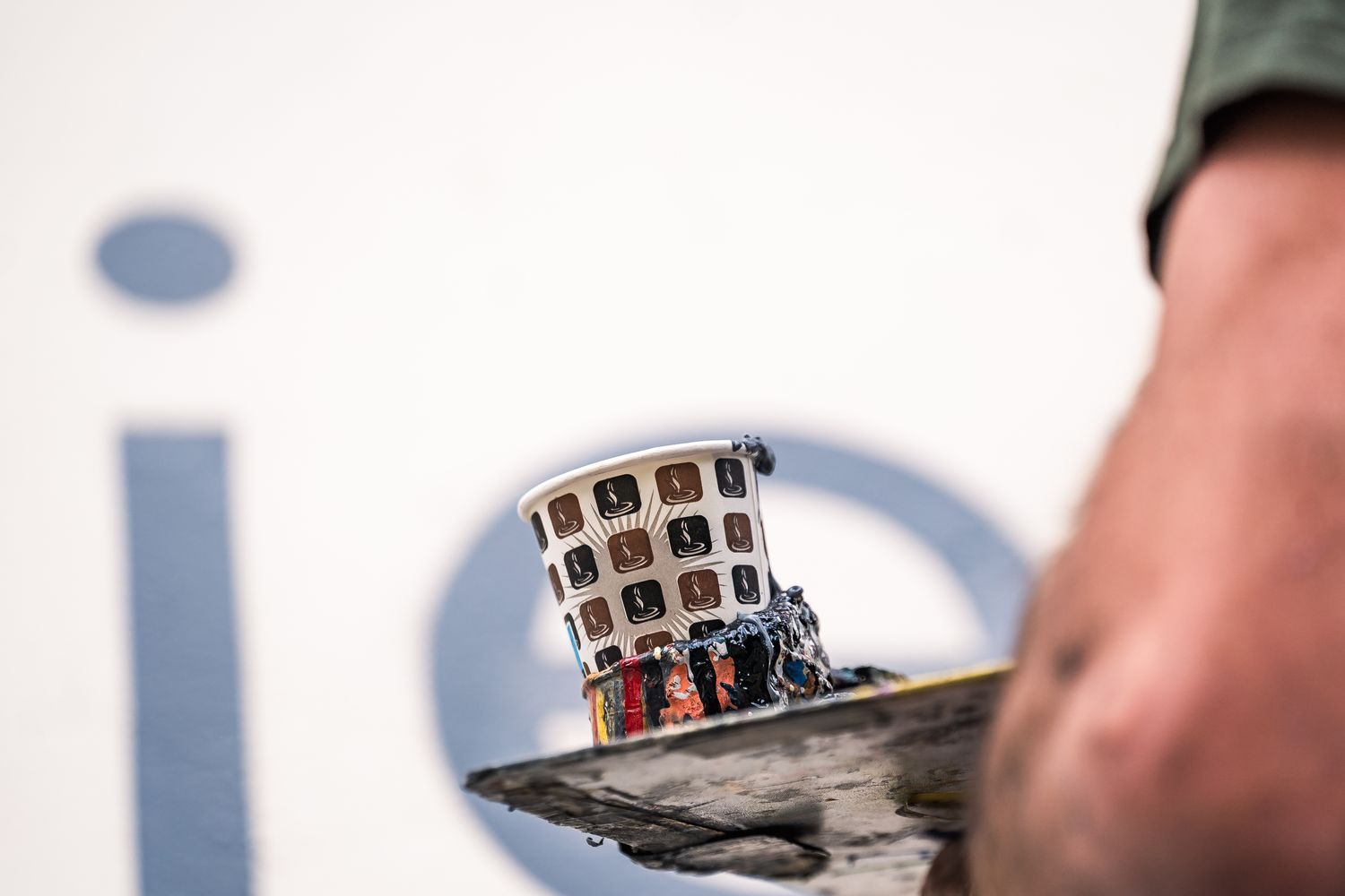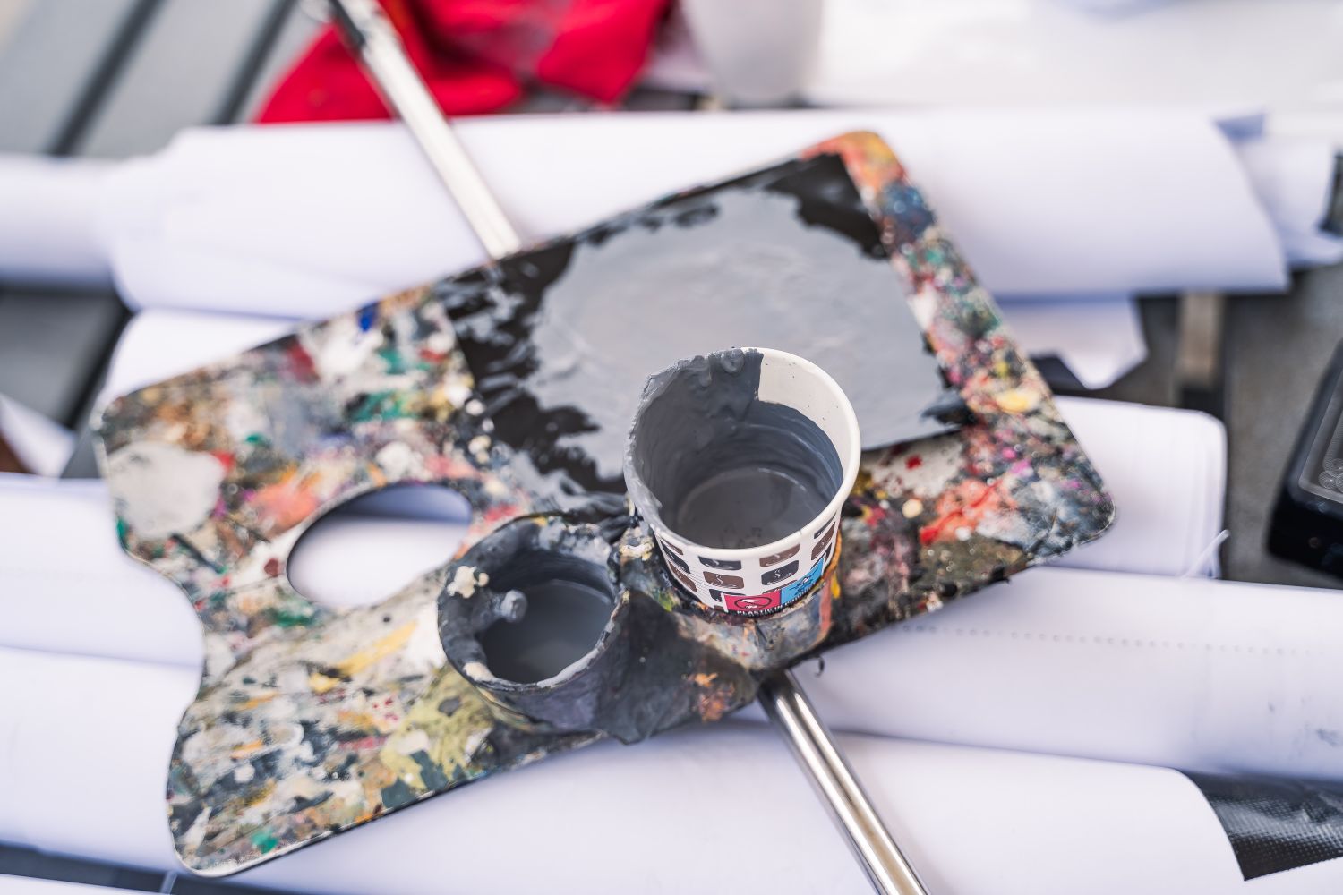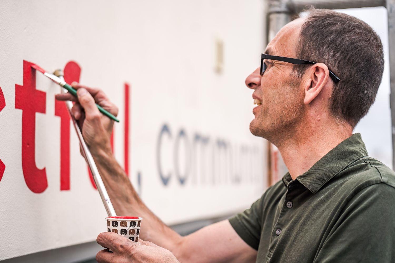 As work progressed, the scope grew to include a large hand-painted compass rose on the concrete forecourt – a symbolic nod to direction, learning and aspiration – alongside plans for matching internal signage that carried the same confident tone throughout the building.