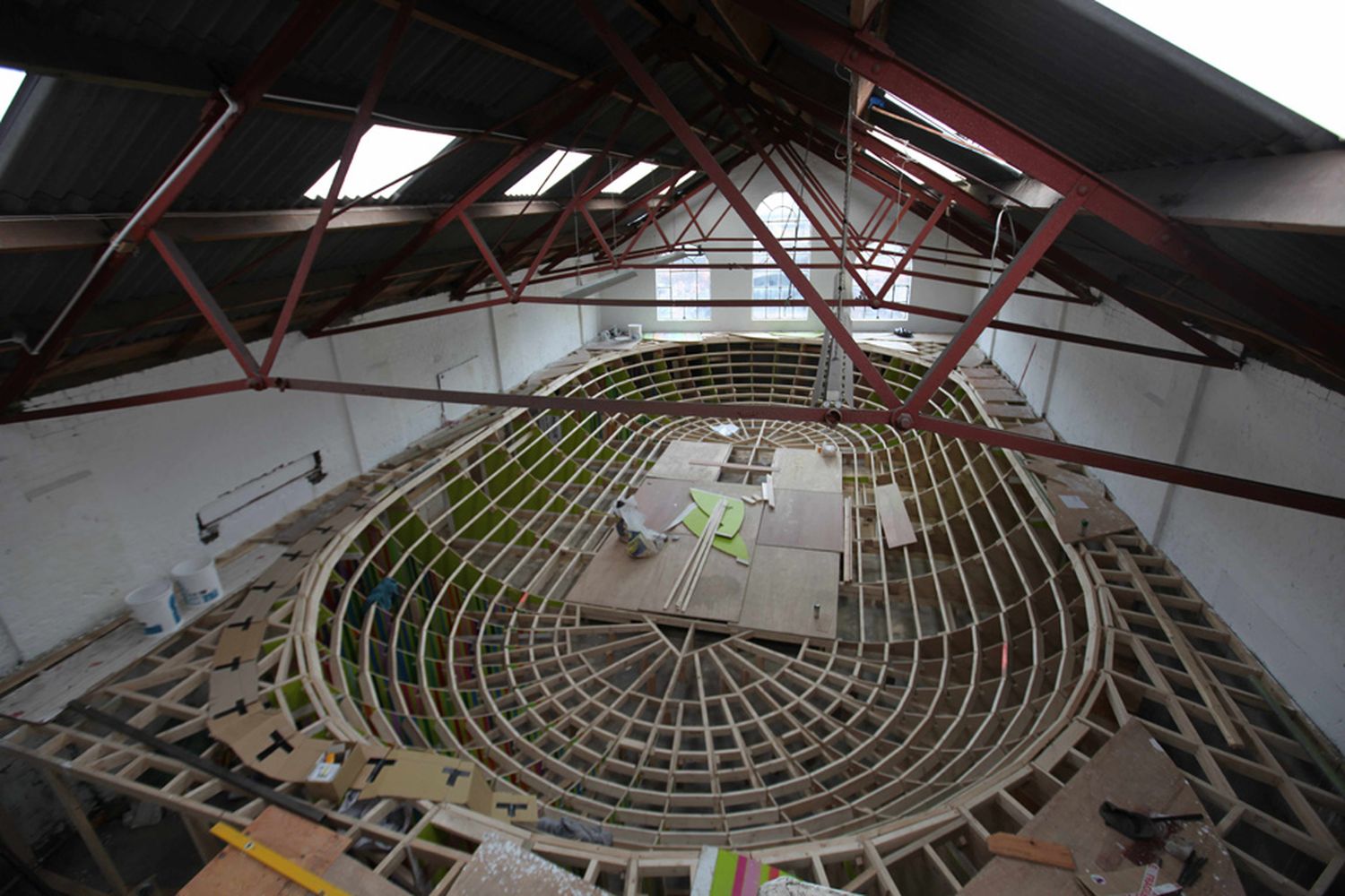 Yeah, thank you! So this is the left over wood from a skate ramp I made – Quaker Street Bowl. The bowl was big, beautiful and curved, and completely constructed from wood that we were given from a building site in Shoreditch. These are the off cuts of marine quality ply and I just couldn’t bare to waste it, because this is really, really nice wood. I cut it into pieces and tried to tessellate them together using templates and a very sharp circular saw. I got halfway, I was like this is taking forever, but I kept on going. So it took about eight days or something, nine days. I do like the wooden crazy paving effect with the shapes and different tones of the wood.